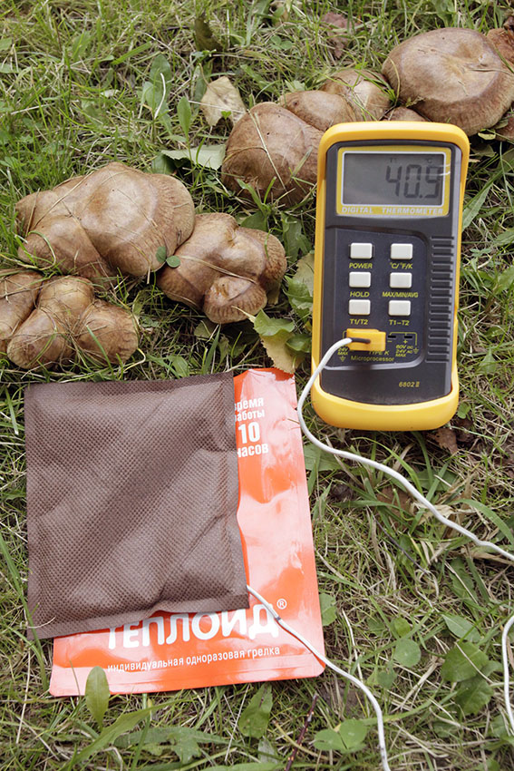 Температура окружающего воздуха была примерно +16C. Упаковка от Теплоида лежала на траве, термодатчик был помещен между упаковкой и пакетом Теплоида.