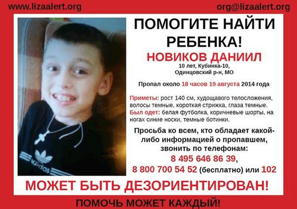 Заголовок сообщения: Re: Пропал Новиков Даниил(10),МО,Кубинка-10 Добавлено: 20 авг 2014, 06:27 |