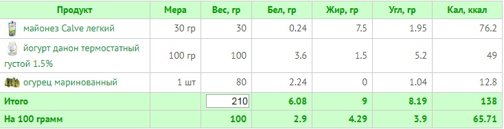 -Майонез Кальве легкий или провансаль легкий 30г - Йогурт Данон термостатный густой 1,5% 100г - Огурец маринованный 1шт