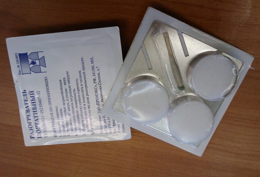 Вот такая плитка  в принципе известна почти всем. Её использование в данном комплекте рассматривается, как одна из альтернатив комплектам, типа "Разогреватель", куда входят просто несколько таблеток "сухого спирта" и одноразовая подставочка из тонкой жести. Смысл применения такой плитки или одноразового комплекта - быстрый разогрев воды прямо на месте без заморочек с костром, если нет термоса с кипятком. Сегодня сделал контрольный эксперимент на открытом воздухе в условиях умеренного ветра по разогреву на такой плитке 400 мл воды в кружке. Цель эксперимента - узнать время, необходимое для достаточного разогрева воды, потребующееся на месте оказания ПП. Кроме самой металлической плитки использовались 2 таблетки "сухого спирта", зажигалка, кружка, фляга с водой. Температура окружающего воздуха +8°С. Хронометраж от момента доставания фляги, плитки и кружки из рюкзака до получения горячей воды температурой "еще чуть-чуть и уже будет слишком горячо для питья" составил ровно 5 минут. Время до полного бурного кипения - 9 минут. Теперь думаю, что 400 мл в качестве разовой "дозы" - это слишком много. Вероятно достаточно 200-250мл с соответственно сокращающимся временем на согрев. Учитывая, что с момента установки кружки с водой на горящую плитку (1 - 1,5 минуты от начала действий на месте обнаружения пострадавшего от гипотермии), следить за этим хозяйством уже не нужно и можно участвовать в других мероприятиях по оказанию ПП, такой вариант получения горячего питья считаю вполне имеющим право на жизнь. На очереди тест с портативным одноразовым комплектом "Разогреватель" и с так называемым, Беспламенным Нагревателем Пищи (БНП). По итогам можно будет решать, что из этого останется в комплекте, а что лишнее. На фото ниже альтернативный комплект - одноразовый "Разогреватель портативный".