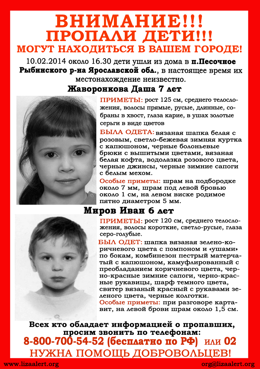 Пропали Жаворонкова Дарья Игоревна 22.03.2006 г. и Миров Иван Александрович 24.12.2007 г., Ярославская обл.,Рыбинский район,пос.Песочное10.02.2014 около 16.30 дети ушли из дома в поселке Песочное и до настоящего времени их местонахождение неизвестно.