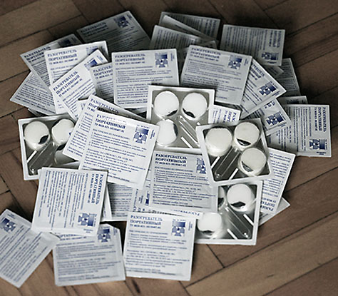 эвакуационных укладок:Первый вид: Комплект "Разогреватель портативный" РП-3 . Это три таблетки сухого топлива, упакованные в блистер с одноразовым таганком и чиркаликом. Кроме непосредственно разогрева воды для пострадавшего от гипотермии, эти таблетки можно использовать для более надёжного и быстрого розжига костра.